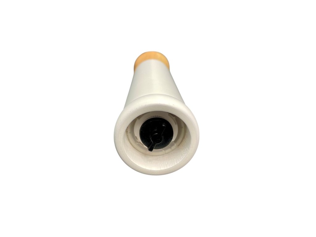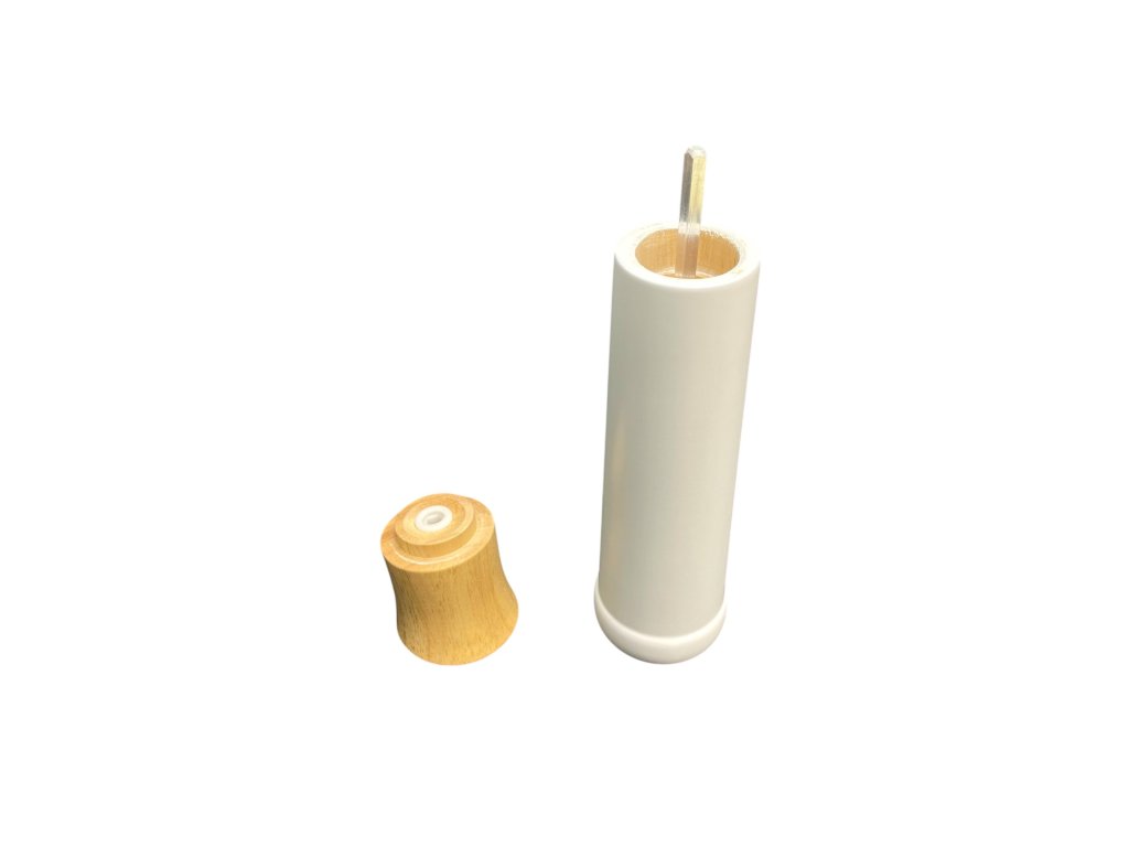 Horní část mlýnku je dřevěná a spodní část je bílá.